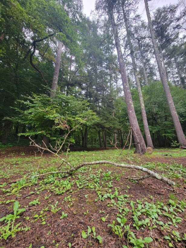 逆に樹々が込み入っている環境では、横に伸びた木の大枝が落下物から頭を守ってくれるバリケードになるような、大木の根元を選ぶのも一つの方法だろう。